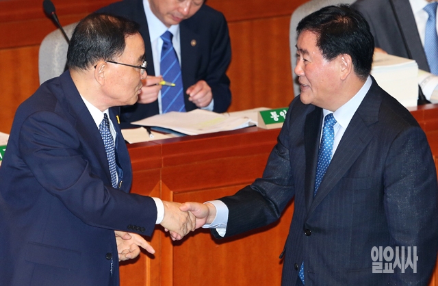 16일 서울 여의도 국회에서 열린 예산결산특별위원회 전체회의에 앞서 정홍원 국무총리(왼쪽)와 최경환 경제부총리 겸 기획재정부 장관이 인사를 나누고 있다.