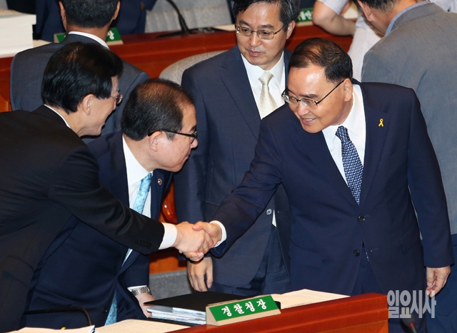 정홍원 국무총리(오른쪽)가 16일 서울 여의도 국회에서 열린 예산결산특별위원회 전체회의에서 참석자들과 인사하고 있다.