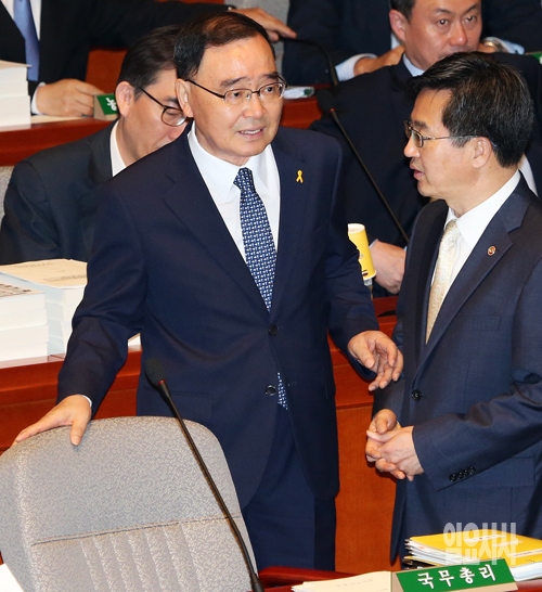 정홍원 국무총리가 16일 서울 여의도 국회에서 열린 예산결산특별위원회 전체회의에 참석하고 있다.