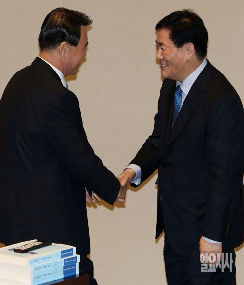 16일 서울 여의도 국회에서 열린 예산결산특별위원회 전체회의에서 홍문표 위원장(왼쪽)과 최경환 경제부총리 겸 기획재정부 장관이 인사를 나누고 있다.