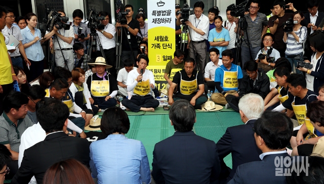 김한길, 안철수 새정치민주연합 공동대표와 박영선 원내대표가 16일 서울 여의도 국회 본청 앞에서 세월호 특별법 제정과 진상규명을 촉구하며 단식농성 중인 가족대책위와 면담을 갖고 있다.