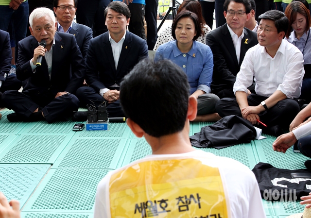 김한길, 안철수 새정치민주연합 공동대표와 박영선 원내대표가 16일 서울 여의도 국회 본청 앞에서 세월호 특별법 제정과 진상규명을 촉구하며 단식농성 중인 가족대책위와 면담을 갖고 있다.