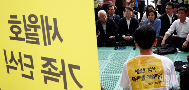김한길, 안철수 새정치민주연합 공동대표와 박영선 원내대표가 16일 서울 여의도 국회 본청 앞에서 세월호 특별법 제정과 진상규명을 촉구하며 단식농성 중인 가족대책위와 면담을 갖고 있다.