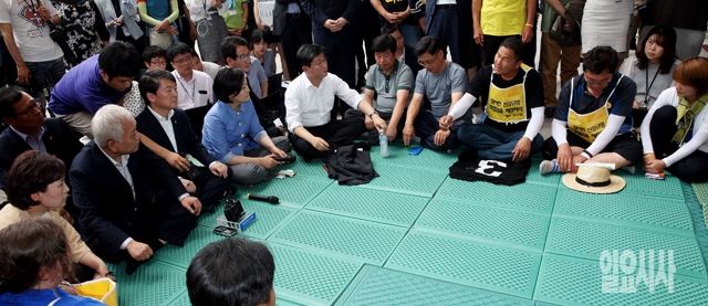 김한길, 안철수 새정치민주연합 공동대표와 박영선 원내대표가 16일 서울 여의도 국회 본청 앞에서 세월호 특별법 제정과 진상규명을 촉구하며 단식농성 중인 가족대책위와 면담을 갖고 있다.