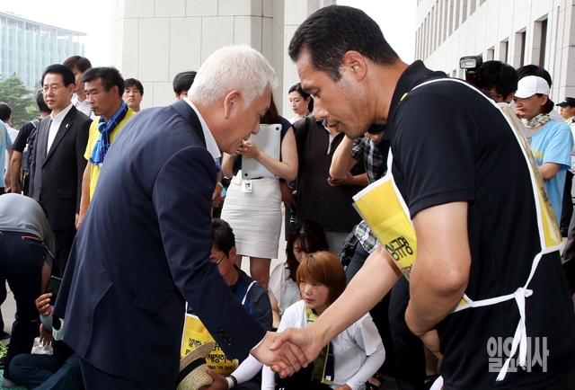 김한길 새정치민주연합 공동대표가 16일 서울 여의도 국회 본청 앞에서 세월호 특별법 제정과 진상규명을 촉구하며 단식농성 중인 가족대책위와 면담을 마친 뒤 인사하고 있다.