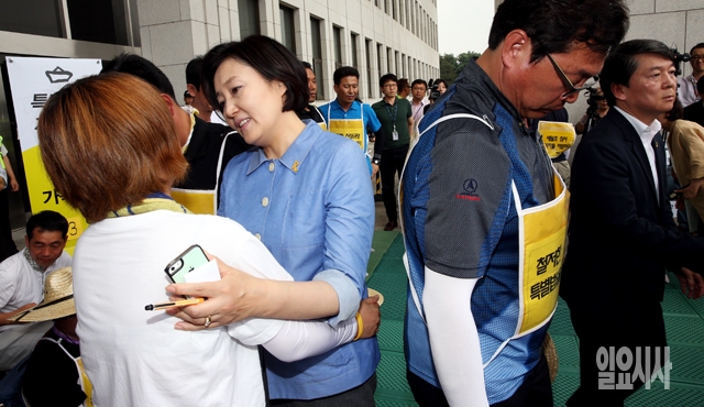 박영선 새정치민주연합 원내대표가 16일 서울 여의도 국회 본청 앞에서 세월호 특별법 제정과 진상규명을 촉구하며 단식농성 중인 가족대책위와 면담을 마친 뒤 위로하고 있다.