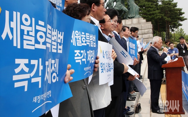 김한길 새정치민주연합 공동대표가 16일 서울 여의도 국회 본청 앞 계단에서 열린 세월호 특별법 통과 촉구 결의대회에서 발언을 하고 있다.