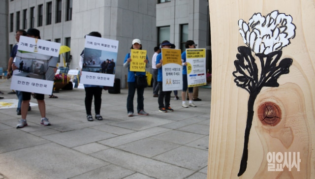 16일 서울 여의도 국회 본청 앞 계단에서 새정치민주연합 의원들이 모여 세월호 특별법 통과 촉구 결의대회를 갖고 있는 가운데 본청 앞에 국화가 그려진 푯말이 세워져 있다.
