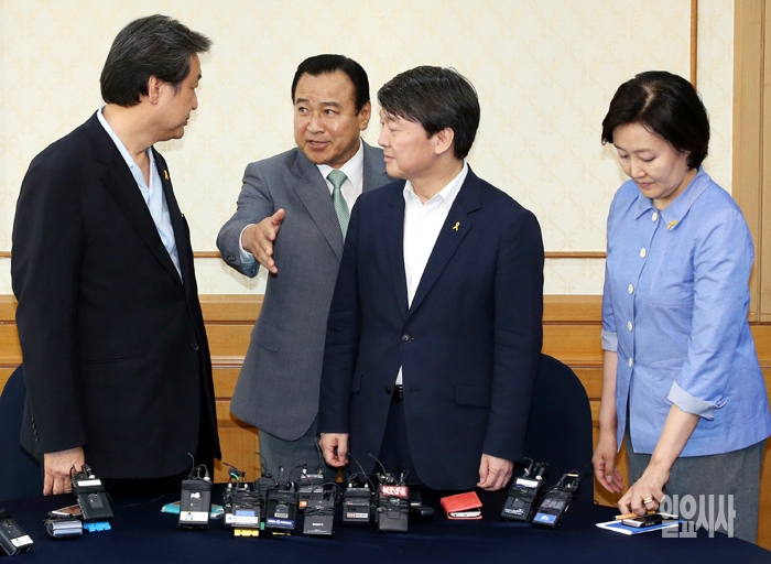 새누리당 김무성 대표와 새정치민주연합 안철수 공동대표  양당 지도부가 16일 오후 국회에서 열린 '세월호 특별법 처리  회동' 하고 있다. 좌측부터 새정치민주연합 박영선 원내대표, 안철수 공동대표, 새누리당 김무성 대표, 이완구 원내대표