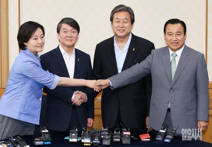새누리당 김무성 대표와 새정치민주연합 안철수 공동대표  양당 지도부가 16일 오후 국회에서 열린 '세월호 특별법 처리  회동'에서 포즈를 취하고 있다. 좌측부터 새정치민주연합 박영선 원내대표, 안철수 공동대표, 새누리당 김무성 대표, 이완구 원내대표