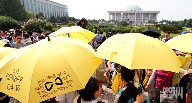 세월호 참사 단원고 생존학생들이 16일 세월호 참사의 진실을 밝히는 도보 행진의 마지막 목적지인 서울 여의도 국회로 도착하고 있다.