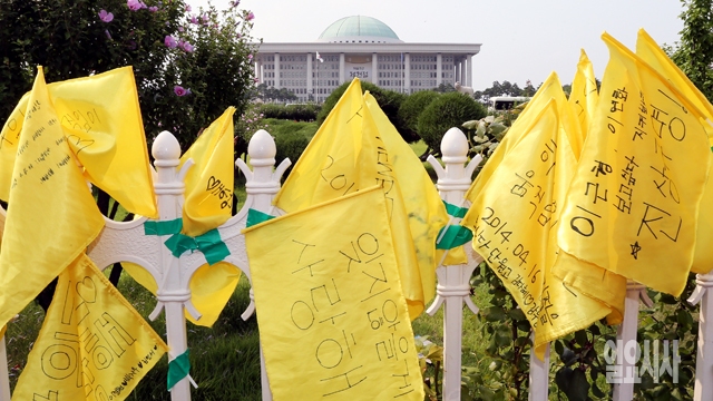 세월호 참사 단원고 생존학생들이 16일 세월호 참사의 진실을 밝히는 도보 행진의 마지막 목적지인 서울 여의도 국회로 도착, 국회 벽에 학생들이 꽂아둔 노란 깃발이 걸려 있다.