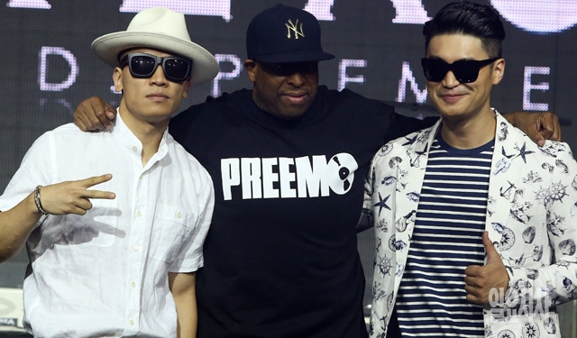 다이나믹 듀오와 DJ 프리미어(가운데)가 16일 서울 마포구 예스24홀에서 열린 새 앨범 '어 자이언트 스텝(A Giant Step)'발매 기념 기자간담회에서 포토타임을 갖고 있다.