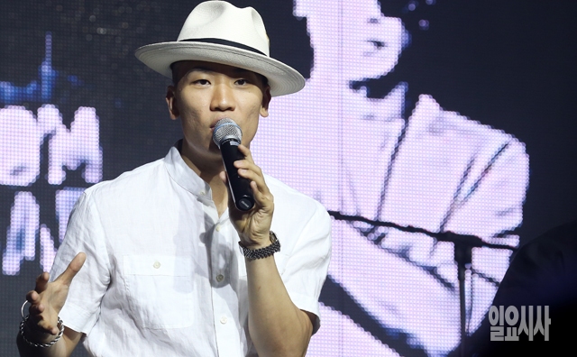 다이마믹 듀오의 개코가 16일 서울 마포구 예스24홀에서 열린 새 앨범 '어 자이언트 스텝(A Giant Step)'발매 기념 기자간담회에서 취재진의 질문에 답하고 있다.