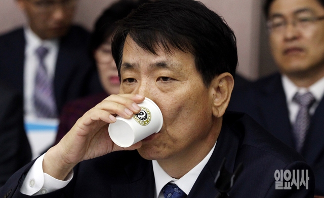 오택영 경기과학기술진흥원장 직무대행이 22일 경기도 수원 경기도청에서 열린 국회 안전행정위원회의 국정감사에서 물을 마시고 있다.