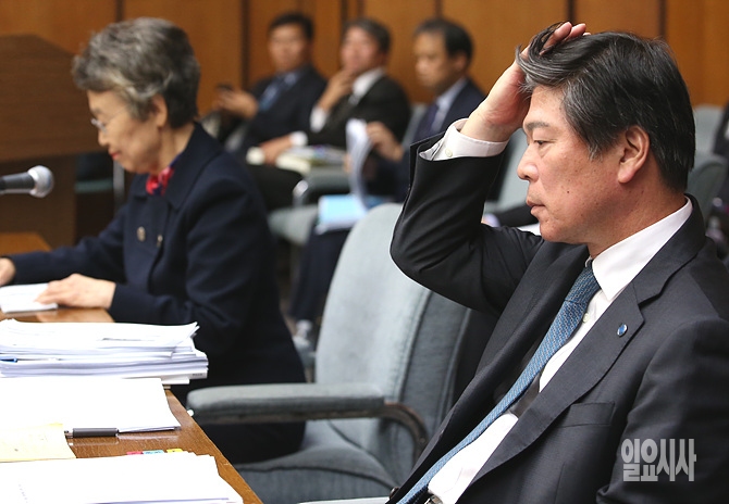 22일 오후, 서울 여의도 미래창조과학방송통신위원회 회의실에서 열린 KBS 등에 대한 국정감사에서 조대현 KBS 사장이 증인으로 출석해 머리를 쓸어 넘기고 있다.
