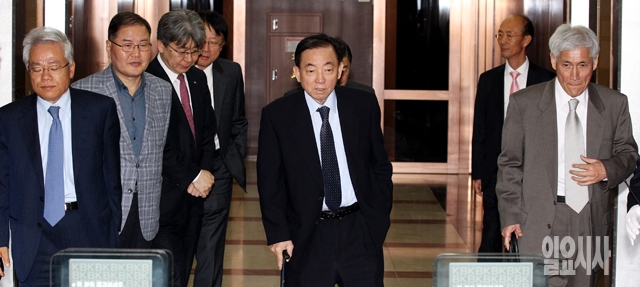 이경재 KB금융지주 이사회 의장(가운데)를 비롯한 이사진들이 29일 서울 중구 명동 KB금융지주 본점에서 열린 'KB금융지주 제6차 회장후보추천위원회 및 임시이사회'를 마친 뒤 나서고 있다.