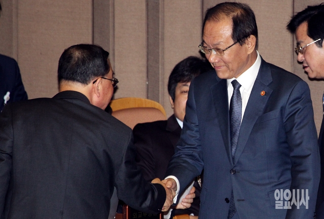 정홍원 국무총리와 황우여 교육부 장관이 5일 서울 여의도 국회 본회의장에서 열린 교육·사회·문화 분야 대정부 질문에 앞서 인사를 나누고 있다.
