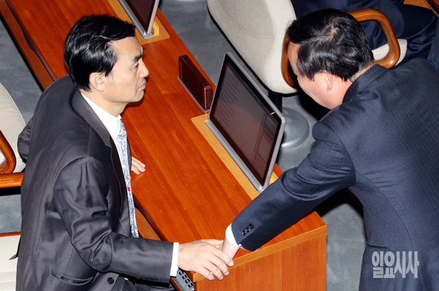 새누리당 김재원 원내수석부대표(오른쪽)와 새정치민주연합 안규백 원내수석부대표가 5일 서울 여의도 국회 본회의장에서 열린 교육·사회·문화 분야 대정부 질문에서 대화하고 있다.