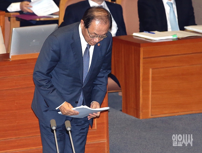 5일, 서울 여의도 국회 본회의장에서 열린 사회·교육·문화 분야에 대한 국회 대정부질문에 출석한 황우여 교육부장관이 의원들에게 인사하고 있다.