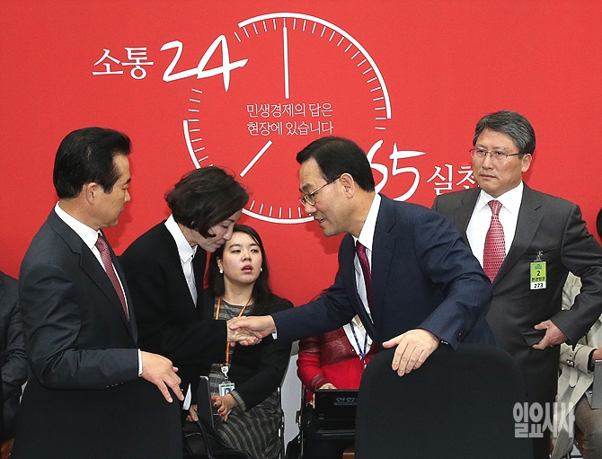 5일, 서울 여의도 국회에서 새누리당 주호영 정책위의장, 신성범 의원, 김용복 자사고교장협의회장, 양순지 학부모협의회장 등이 참석해 면담 을 가진 가운데, 주 정책위의장과 양순지 학부모협의회장이 악수를 나누고 있다.