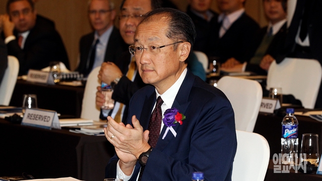 김용 세계은행 총재가 5일 서울 중구 밀레니엄 힐튼호텔에서 열린 '개도국 진출기반 강화를 위한 코트라-세계은행그룹 포럼'에서 박수를 치고 있다.