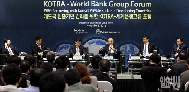 김용 세계은행 총재(오른쪽에서 세번째)가 5일 서울 중구 밀레니엄 힐튼호텔에서 열린 '개도국 진출기반 강화를 위한 코트라-세계은행그룹 포럼'에서 발언을 하고 있다.