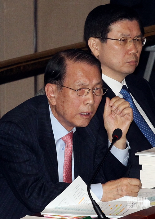 김기춘 대통령비서실장이 6일 서울 여의도 국회에서 열린 예산결산특별위원회에서 의원들의 질의에 답하고 있다.