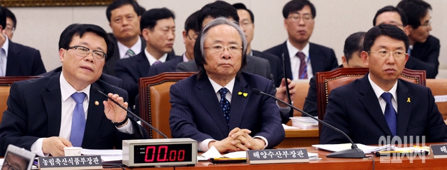 이동필 농림축산식품부 장관(왼쪽부터), 이주영 해양수산부 장관, 김석균 해양경찰청장이 6일 서울 여의도 국회에서 열린 농림축산식품해양수산위원회 전체회의에 참석, 의원들의 질의에 답하고 있다.