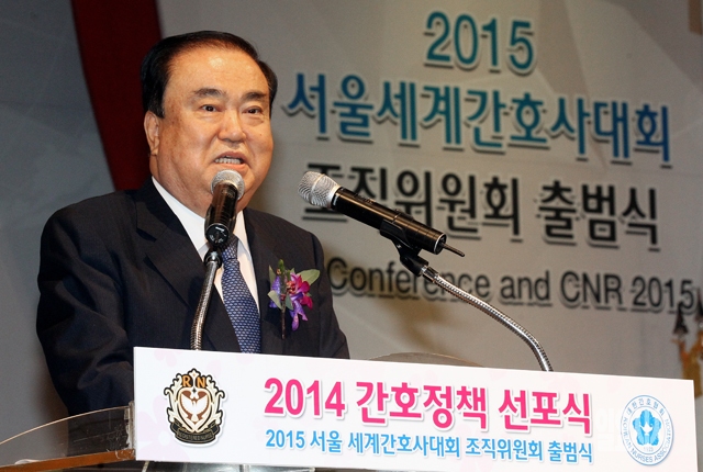 새정치민주연합 문희상 비상대책위원장이 6일 서울 방이동 올림픽공원 SK핸드볼경기장에서 열린 '2014 간호정책 선포식 및 2015 서울 세계간호사대회 조직위 출범식'에서 축사를 하고 있다.