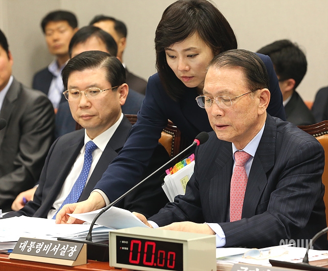 6일, 서울 여의도 국회에서 열린 예산안 관련 전체회의 도중, 조윤선 청와대 정무수석비서관이 김기춘 대통령 실장에게 자료를 건네고 있다.
