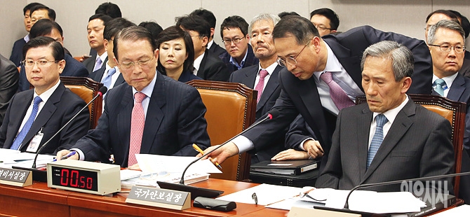 6일, 서울 여의도 국회 운영위원회 회의실에서 열린 예산안심사 전체회의 도중, 김기춘 비서실장이 관계자로부터 보고자료를 건네받고 있다.
