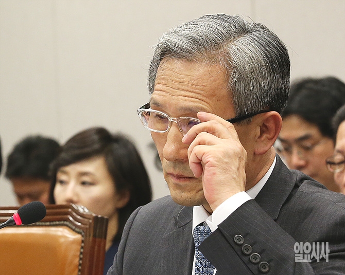 6일, 서울 여의도 국회 운영위원회 회의실에서 열린 예산안심사 전체회의에서 김관진 국가안보실장이 안경을 만지고 있다.