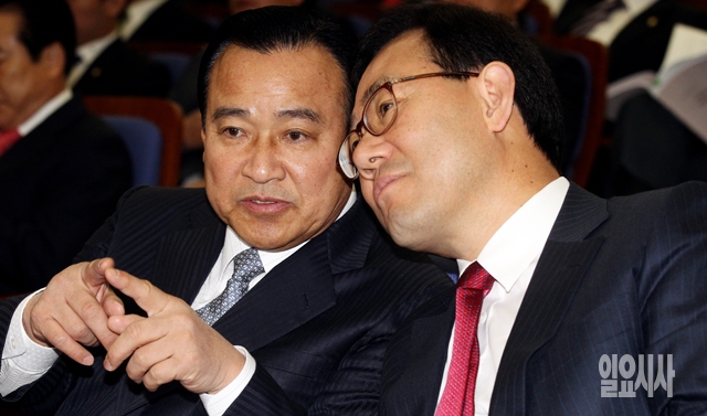새누리당 이완구 원내대표(왼쪽)와 주호영 정책위의장이 7일 서울 여의도 국회에서 열린 의원총회에서 이야기를 나누고 있다.