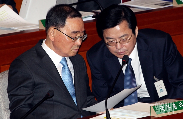 정홍원 국무총리(왼쪽)가 7일 서울 여의도 국회에서 열린 예산결산특별위원회 전체회의에서 관계자에게 보고를 받고 있다.