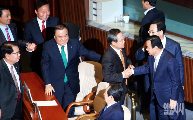 7일 서울 여의도 국회에서 열린 본회의에서 세월호 특별법이 통과된 후 새누리당 이완구 원내대표가 새정치민주연합 지도부를 찾아 인사하고 있다.