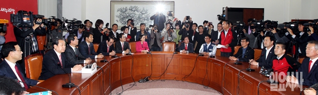 새누리당 김무성 대표를 비롯한 참석의원들이 7일 서울 여의도 국회 당대표실에서 공무원연금개혁 관련 공무원투쟁본부 지도부와의 면담을 갖고 있다.