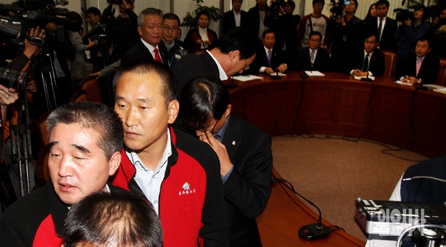 공무원연금개혁 관련 공무원투쟁본부 지도부들이 7일 서울 여의도 국회 새누리당 대표실에서 김무성 대표와의 면담을 중단한 뒤 나서고 있다.