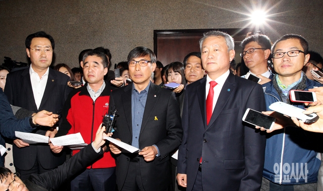 공무원연금개혁 관련 공무원투쟁본부 지도부들이 7일 서울 여의도 국회 새누리당 대표실에서 김무성 대표와의 면담을 중단한 뒤 취재진에게 입장을 밝히고 있다.