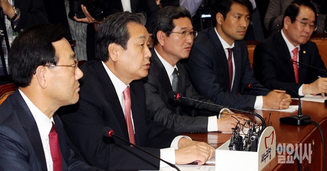 새누리당 김무성 대표(왼쪽에서 두번째)가 7일 서울 여의도 국회 당대표실에서 공무원연금개혁 관련 공무원투쟁본부 지도부와의 면담을 갖고 발언을 하고 있다.