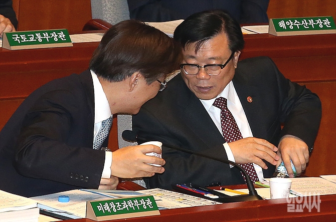 10일 오전, 국회에서 예산안 심사를 위해 열린 예결위 전체회의 직전, 최양희 미래창조과학부장관과 이동필 농림축산식품부장관이 잠시 이야기를 나누고 있다.