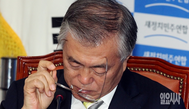 새정치민주연합 문재인 비대위원이 10일 서울 여의도 국회에서 열린 비상대책위원회의에서 안경을 고쳐쓰고 있다.