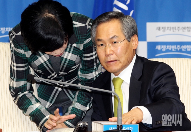 새정치민주연합 우윤근 원내대표와 김영주 의원이 10일 서울 여의도 국회에서 열린 당무위원회의에서 대화를 나누고 있다.