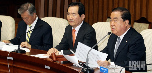 새정치민주연합 문희상 비상대책위원장(맨 오른쪽)이 10일 서울 여의도 국회에서 열린 당무위원회의에서 모두발언을 하고 있다.