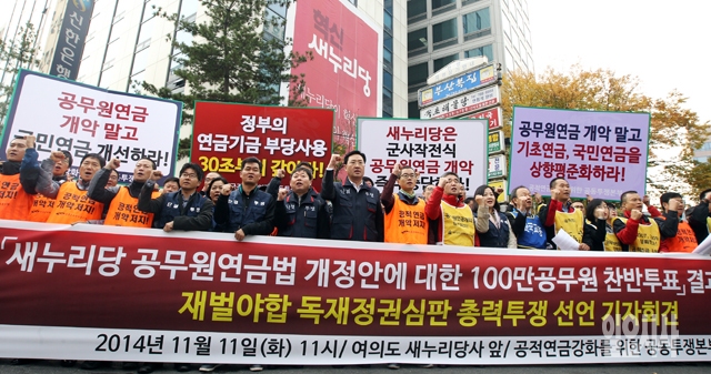 공적연금강화를 위한 공동투쟁본부 공동대표 등을 비롯한 참석자들이 11일 서울 여의도 새누리당사 앞에서 새누리당 공무원연금법 개정안에 대한 100만 공무원 찬반투표 결과 발표 및 총력투쟁 선언 기자회견을 갖고 있다.