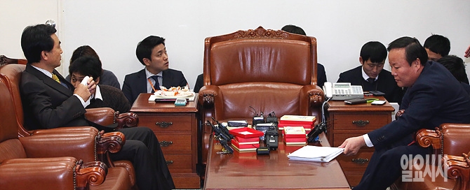 11일 오전, 서울 여의도 국회 운영위원장실에서 여야주례회동을 갖고 있는 가운데, 김재원·안규백 여야 원내수석부대표가 회동을 기다리고 있다.