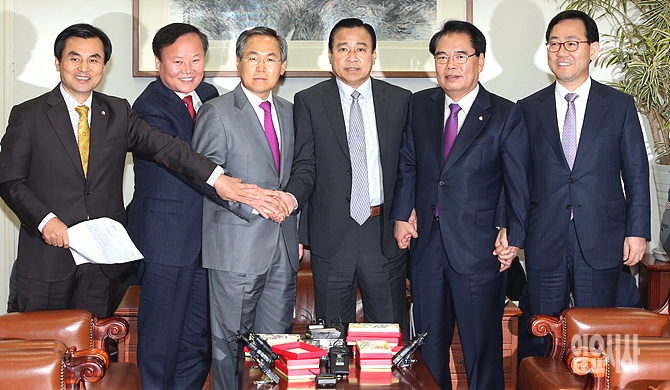 11일 오전, 서울 여의도 국회 운영위원장실에서 열린 여야주례회동 직후, 새누리당 이완구(사진 오른쪽서 세 번째)·새정치민주연합 우윤근 원내대표(사진 왼쪽서 세 번째), 새누리당 김재원(사진 왼쪽서 두 번째)·새정치민주연합 안규백(사진 왼쪽) 원내수석부대표, 새누리당 주호영(사진 오른쪽)·새정치민주연합 백재현 정책위의장(사진 오른쪽서 두 번째)이 손을 잡고 있다.