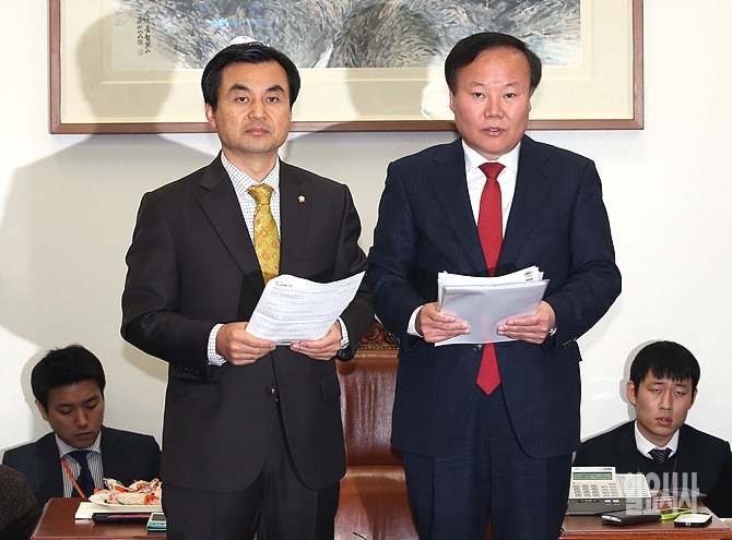 11일 오전, 서울 여의도 국회 운영위원장실에서 열린 여야주례회동 직후, 새누리당 김재원·안규백 새정치민주연합 원내수석부대표(사진 왼쪽)이 회동문을 발표하고 있다.