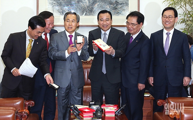 11일 오전, 서울 여의도 국회 운영위원장실에서 열린 여야주례회동 직후, 새누리당 이완구(사진 가운데)·새정치민주연합 우윤근 원내대표(사진 왼쪽서 세 번째)가 농민의 날을 맞이해 미리 준비한 가래떡과 찹쌀떡을 소개하고 있다.