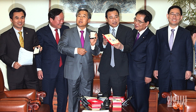 11일 오전, 서울 여의도 국회 운영위원장실에서 열린 여야주례회동 직후, 새누리당 이완구(사진 오른쪽서 세 번째)·새정치민주연합 우윤근 원내대표(사진 왼쪽서 세 번째)가 농민의 날을 맞이해 미리 준비한 가래떡과 찹쌀떡을 소개하고 있다.